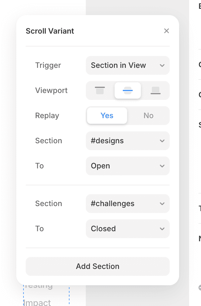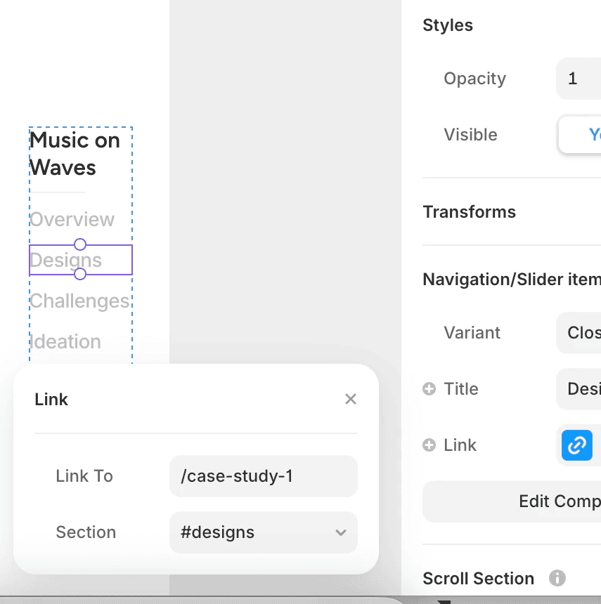 This component allows you to create a smooth navigation experience for case study pages. To set it up, create scroll sections on your website and link each navigation item to the corresponding section. Make sure to enable the scroll variant so the navigation updates dynamically as users scroll through the page.